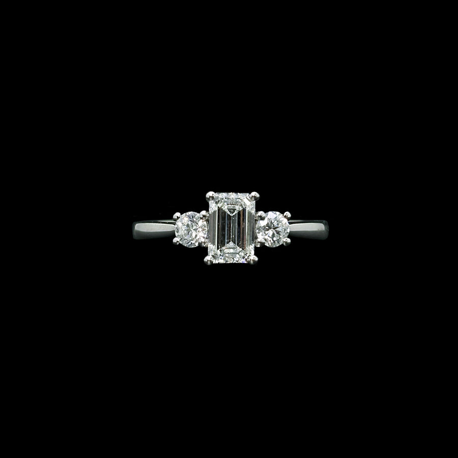 This ring features a GIA certified emerald cut Diamond as the centre stone accompanied by round brilliant cut Diamonds either side.