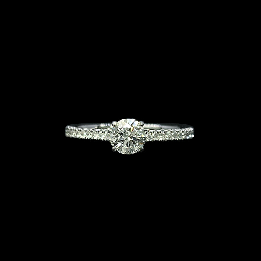 This Diamond solitaire features a round brilliant, GIA certified Diamond, claw set in Platinum, with Diamond set shoulders.